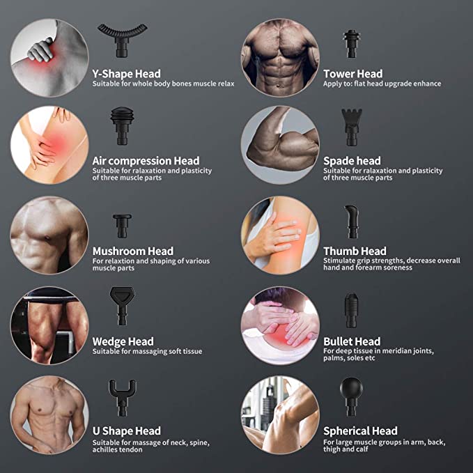 10 Massage heads & 30-speed levels: Our muscle massager gun boasts 10 massage heads and 30-speed levels to target various massage groups, including options for deep tissue. Ideal for use in your legs, arms, back, torso and neck.