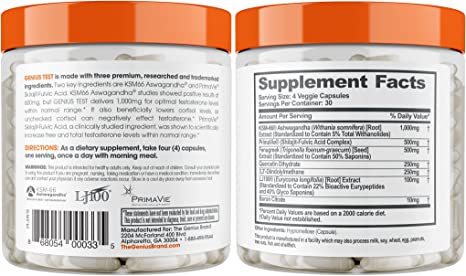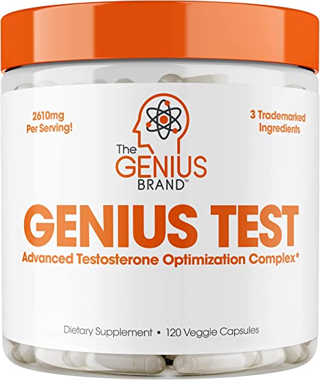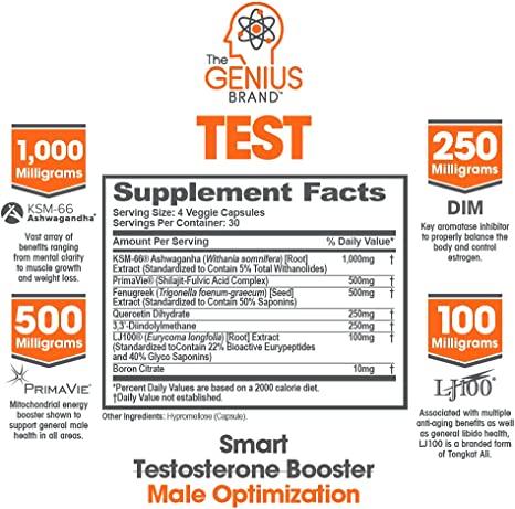 Smart Male Optimization: Genius Test by The Genius Brand is designed to enhance energy, mental clarity, stamina, strength, vigor, and wellness for men. Our natural, scientifically backed formula includes KSM-66 Ashwagandha, Diindolylmethane (DIM), and PrimaVie.* Vegan and made in the USA with no proprietary blends. Serving size 4 capsules, 30 servings per container.