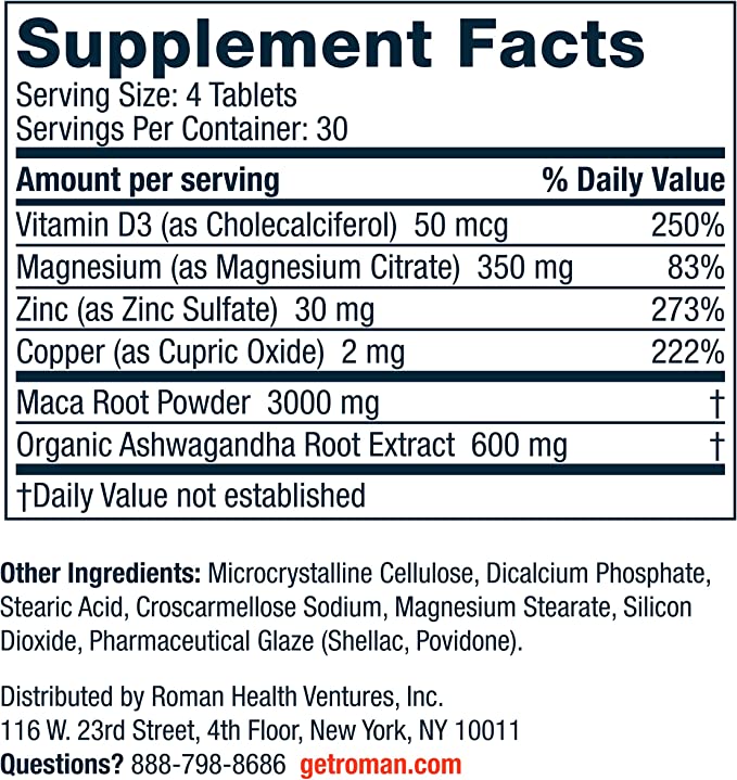 WHY YOU WANT IT: Formulated with a blend of Ashwaganda, Vitamin D3, Zinc, Magnesium, Maca, and Copper. The nutrients in Roman Testosterone Support work together to help physical performance, bone health, and muscle function, while featuring ashwagandha to support healthy testosterone levels.*